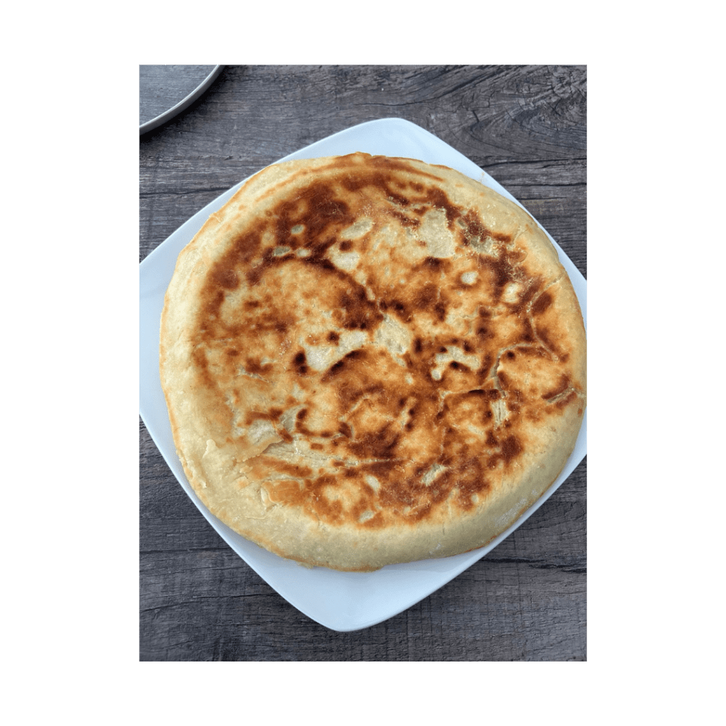 - Place the dough in the greased pan (making sure it curves up on the sides a bit) and then add the filling of your choice. Then roll the other half of the dough and place on the top using the curved-up sides of the bottom layer to close.